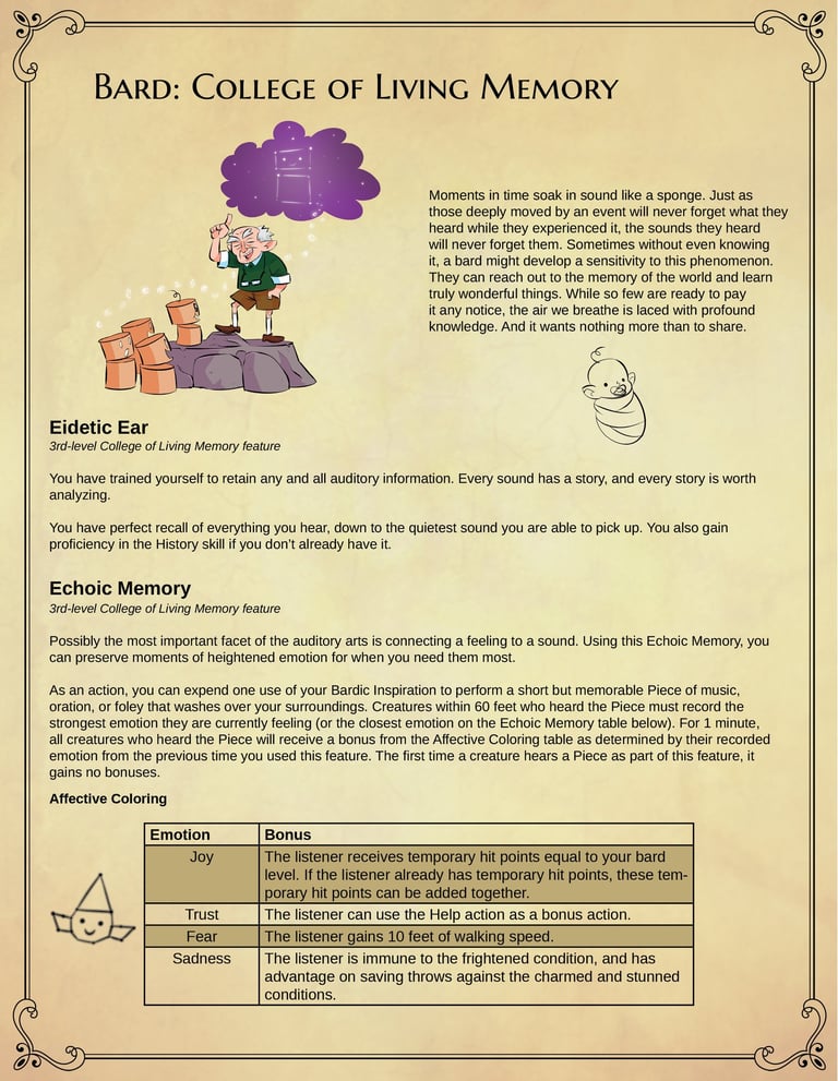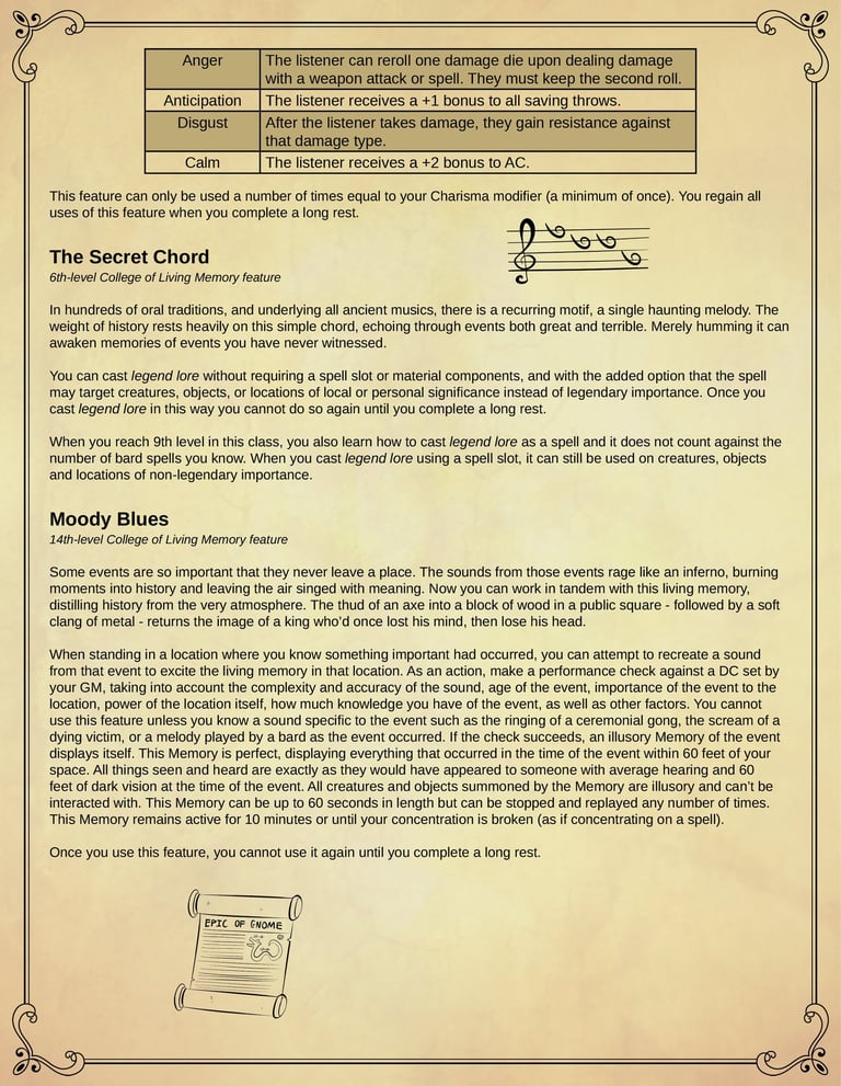The Odyssey, Beowulf, The Ibonia, tales that have survived the ages by word of mouth alone. Create an undying story as you spin a tale for your party, granting them enhancements by genre, recite epics and uncover the truth of ancient artifacts and events. History may be doomed to repeat itself, but you are designed to repeat history.